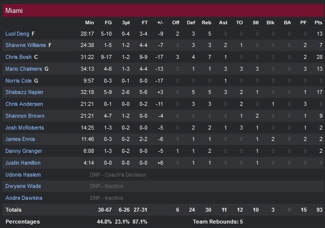 Los Angeles s’amuse et claque 7 dunks et 7 trois-points dans les 24 premières minutes du match alors que Miami rate ses 11 premières tentatives à 3-points pendant ce temps. DeAndre Jordan marque 12 points à 6/6 (facile quand ce ne sont que des dunks !) et gobe 11 rebonds alors que son équipe mène déjà 39-15 (après un 34-11) après un quart-temps (Miami n’atteindra les 39 points que 30 secondes avant la pause). Chris Bosh (9/17, 7 rebonds) comble les trous avec 28 points mais le Heat tombe à domicile pour la troisième fois d’affilée, ce qui n’était pas arrivé depuis mars 2011. Sortie du banc, Shabazz Napier (1,85m) réalise son meilleur match en carrière jusque-là avec 17 points à 5/9 et 5 rebonds.