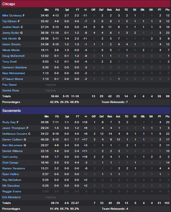 Décimés avec les absences de Pau Gasol et Derrick Rose, les Bulls ont été menés une grande partie du match la faute notamment au trio DeMarcus Cousins, Rudy Gay et Darren Collison. Face à la raquette des Bulls et à leurs prises à deux Cousins a tout de même sorti un gros match avec 22 points, 14 rebonds et 4 passes en 34 minutes. Rudy Gay ajoute 20 points et Darren Collison 17 points et 12 passes.