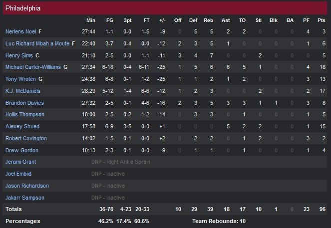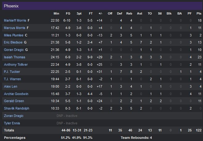 Phoenix a obtenu une troisième victoire consécutive sur le parquet des 76ers. Portés par les 23 points d’Isaiah Thomas (6/9, 8 passes) et les 18 points de Markieff Morris (6/10), les Suns infligent aux Sixers leur 12e défaite de la saison en autant de matchs. Phoenix shoote à 69% en première mi-temps (51.2% sur le match, contre 46.2% chez les 76ers, qui balance un 4/23 à 3-points au passage) et un 20-4 leur a permis de prendre le large très tôt.