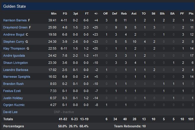 Bien reposés après 4 jours off, les Warriors n’ont fait qu’une bouchée d’Utah cette nuit. Appliqués en défense, ils mènent 28-13 à la fin du premier quart, 54-32 à la mi-temps et enfin 85-57 avant d’entamer le dernier quart. Rudy Gobert profite du désert laissé par ses coéquipiers pour inscrire 12 points à 6/7, prendre 5 rebonds et lâcher deux contres et deux interceptions en 17 minutes de jeu. Côté Warriors, pas d’étincelles puisque Steve Kerr a pu faire tourner son effectif.