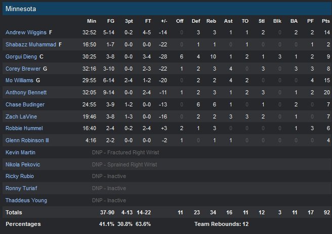 Face à Mo Williams et Zach LaVine, Parker a tué les Wolves à petit feu avec ses pénétrations assassines. D’autant que le meneur français qui veut terminer sa saison à 40% de réussite derrière la ligne était tout aussi adroit de loin (62.5% de réussite à 10/16 cette saison). Tim Duncan termine à 9 points et 10 rebonds en 23 minutes alors qu’Austin Daye fait son match avec 13 points et 11 rebonds. Minnesota est resté un petit moment dans le match grâce aux pertes de balles des Spurs (20 sur le match) mais le troisième quart-temps marqué par une défense de fer des Texans leur a été fatal (32-14).