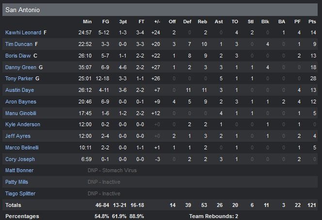 Bien parti en première mi-temps, Andrew Wiggins (14 points) est privé de panier pour la suite de la rencontre. À noter que Marco Belinelli (aine) a joué son premier match en 9 rencontres et termine à 5 points en 11 minutes. San Antonio peut par contre s’inquiéter de la possible blessure à la cheville de Cory Joseph, qui boitait dans le deuxième quart-temps. Gregg Popovich a indiqué que le meneur était incertain pour samedi.