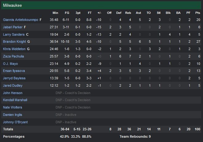En difficulté durant une grande partie de la première mi-temps (shoots manqués, pertes de balles), les Wizards sont en retard 42-27 quand Jerryd Bayless rentre son layup à 5″51 de la mi-temps. Un 20-8 en leur faveur plus tard, l’écart n’est plus que de trois points, 50-47 à la pause, merci au 3-points de John Wall à 28 secondes du buzzer (les 7 derniers points de la série sont d’ailleurs pour lui). Malgré 20 points de Giannis Antetokounmpo et 27 unités pour Brandon Knight, les Bucks continuent à subir et encaissent un 19-8 pour démarrer le quatrième et dernier quart. Le score est de 93-78 suite à un tir lointain de Bradley Beal (17 points) à 7″15.