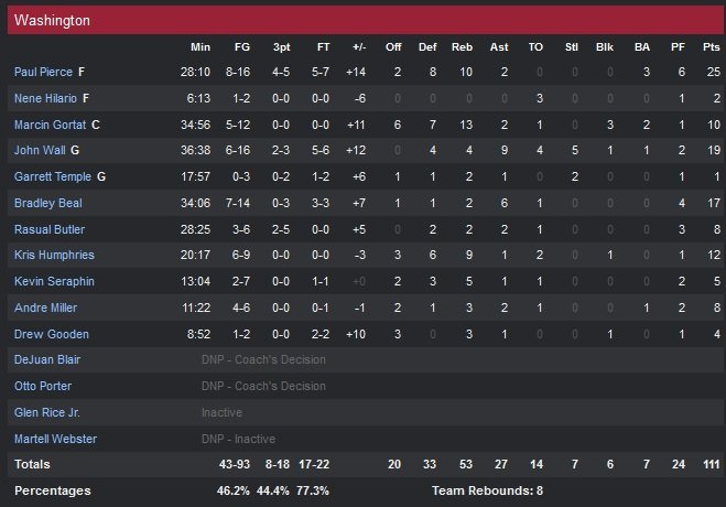 Menés de 15 points en première mi-temps, les Wizards ont parfaitement réagi pour aller chercher leur 9e victoire de la saison sur le parquet de Milwaukee, 111-100. Paul Pierce et John Wall sont les héros du soir pour Washington avec respectivement 25 points à 8/16 et 10 rebonds et 19 points à 8/16, 9 passes et 5 interceptions.
