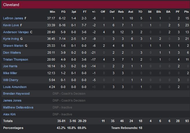 Kevin Love a été servi avec 23 points à 8/16 tandis que Kyrie Irving termine à 21 points à 7/14 et 6 passes. LeBron James, qui a passé les 6 dernières minute sur le banc, finit à 15 points (6/12) 10 passes mais surtout 5 ballons perdus (18 au total pour Cleveland contre seulement 8 pour Toronto).