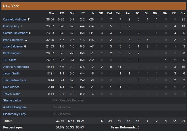Tout sourire, Jose Calderon (3 points, 3 passes, 3 rebonds et 2 interceptions) a pu joué son premier match de la saison (mollet) alors que les Knicks oublient une série de deux défaites. À l’occasion, Philadelphie devient la première équipe depuis 2009-10 et les Nets (0V-18D) à perdre leurs 13 premiers matchs. Pas si ridicules qu’on pourrait les imaginer, les 76ers (40% de réussite contre 50 pour leurs bourreaux du jour) se sont battus mais n’ont pas réussi à rattraper leurs trois quarts-temps trop moyens aux tirs (ils ont pris jusqu’à 21 points de retard). Nerlens Noel réaliste la meilleure soirée de sa jeune carrière avec 17 points (6/11) et 12 rebonds. Philadelphie se rapproche à 85-77 à deux minutes de la fin du match mais Carmelo Anthony veille et enchaîne deux paniers qui entérinent la victoire des Knicks.