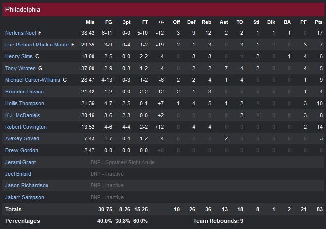 Seuls deux joueurs du banc (Hollis Thompson et Robert Covington avec 10 et 14 points) hormis Nerlens Noel dans le cinq atteignent les 10 points pour Philadelphie. Michael Carter-Williams reste bloqué à 9 unités (4/13) et perd 4 ballons. Les Knicks auront une semaine prochaine compliquée avec des voyages à Houston (lundi) , Dallas et Oklahoma City. Quant aux 76ers, il faudra continuer à y croire lors de la réception de Portland lundi.