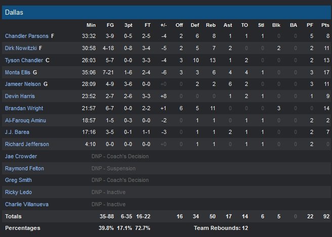 Dallas passe finalement devant à moins d’une minute de la fin et compte 4 longueurs d’avance avant de donner deux lancers à James Harden. Monta Ellis (17 points, leader offensif de l’équipe) rate de l’autre côté et permet à Harden de donner un petit point à son équipe, 93-92 à 28 secondes de la fin. C’est encore lui qui va chercher le ballon dans les mains d’Ellis sur la possession suivante pour sceller la victoire via deux lancers de Trevor Ariza. Dallas aura une chance d’égaliser mais Dirk Nowitzki puis Ellis rate encore la cible à 3-points dans les dernières secondes de la rencontre. En feu à 3-points contre les Lakers hier (18 shoots réussis), les Mavs ont eu affaire à une bien meilleure défense cette nuit et termine à un bien moche 6/35 derrière la ligne cette nuit et tombent malgré leur avantage dans la raquette.