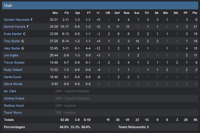 Utah revient à nouveau dans le troisième quart, cette fois à un point, 73-72 avec d’abord un 10-2 puis un 10-0 avec 1″26 à jouer grâce à un 2+1 de Burke et un 3-points signé Ingles. Les joueurs de Quin Snyder prendront même la tête en début de quatrième quart-temps sur un layup de Booker, 80-78. Chicago (50%) reprend brièvement 3-points d’avance 87-84 sur un 3-points d’Aaron Brooks mais Utah (48.8%) répond avec 7 points consécutifs et repasse devant, 91-87, puis 93-89 sur deux shoots de Favors à 2’52. Utah ne marque alors qu’un seul panier en près de 3 minutes et les Bulls reprennent l’avantage sur une claquette de Dunleavy à 22.5 secondes (96-95) puis Gasol rentre un de ses deux lancers-francs après avoir gagné la possession sur un entre-deux à 3.2 secondes. Utah avait une dernière chance de tuer le match sur une bonne position d’Hayward à 3-points face au cercle mais son shoot est court.