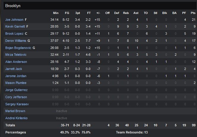 Teletovic sur un layup redonne l’avantage aux Nets 76-74 à 9″40. Un peu plus tard Williams enfonce le clou, 90-83 à 2″48. Les 76ers se rapprocheront au maximum à deux points et avaient un ballon pour égaliser avec une minute restante mais Wroten commet la perte de balle de trop. Kevin Garnett en profite pour inscrire deux points lointains (93-89 à 32.8 secondes) et le score restera en faveur des Nets jusqu’au buzzer final.