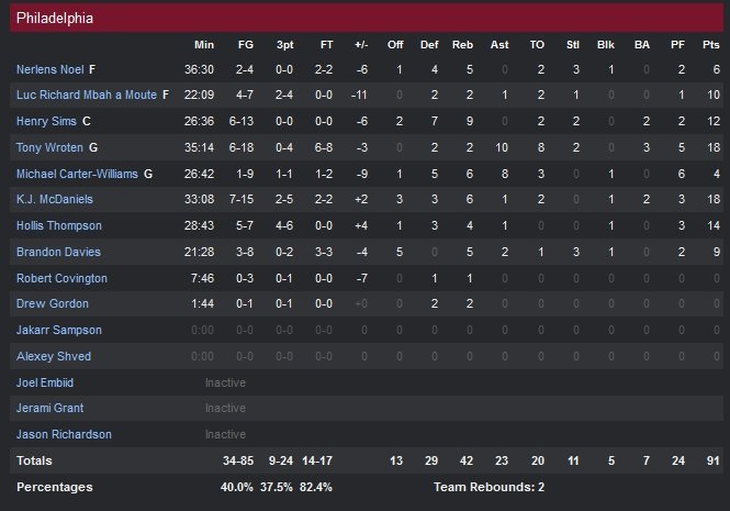 K.J. McDaniels et Tony Wroten se partagent la marque pour Phila, qui pourrait battre le record de médiocrité des Nets (0V-18D) le 5 décembre face à OKC. Avant cela, les hommes de Brett Brown rencontreront Dallas samedi, San Antonio lundi et Minnesota le 3 décembre. Sentant la sanction arriver dans le premier quart-temps (perdu 32-19), les 76ers se reprennent bien dans le deuxième quart en limitant les Nets à seulement 17 points dans les 12 minutes suivantes mais compte encore 8 points de retard à la pause, 49-41. Brooklyn se réveille en inscrivant les 9 premiers points du troisième quart-temps (58-41). Le momentum change de camp et les Sixers passent un 26-14 aux Nets dans les 8″58 qui suivent pour recoller à 5 points avant d’entamer le dernier quart-temps. Cela continue dans les premières minutes de la dernière période avec un 7-0 (conclut par un alley oop Michael Carter-Williams/Nerlens Noel) en faveur de Philadelphie, qui prend la tête pour la première fois de la rencontre à 10″25, 74-72.