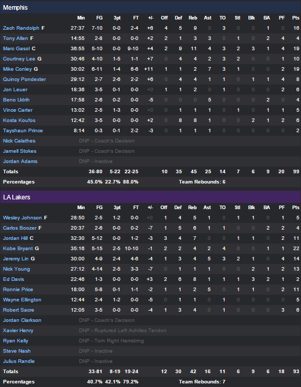 Alors qu’il n’y avait que deux points d’avance pour Memphis à 6’30 du terme, les Lakers ont mal géré la fin du match avec un seul panier signé Kobe Bryant mais ce dernier a shooté à 1/5 et perdu un ballon qui a plié le match à 15 secondes de la fin. Marc Gasol, Mike Conley et Jon Leuer ont inscrit les paniers décisifs pour Memphis dans le money time, coupant à chaque fois les tentatives de retour des Lakers sur la ligne des lancers.