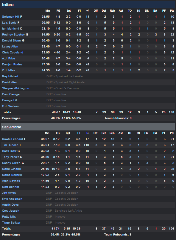 Sans Gregg Popovich (Ettore Messina a pris le relais) absent en raison d’une procédure médicale mineure selon l’équipe, les San Antonio Spurs ont souffert pour battre les Pacers. Ils s’imposent finalement 106 à 100 grâce à leur quatre stars Manu Ginobili (28 points), Tony Parker (21 points), Kawhi Leonard (21 points et 13 rebonds) et Tim Duncan (17 points).
