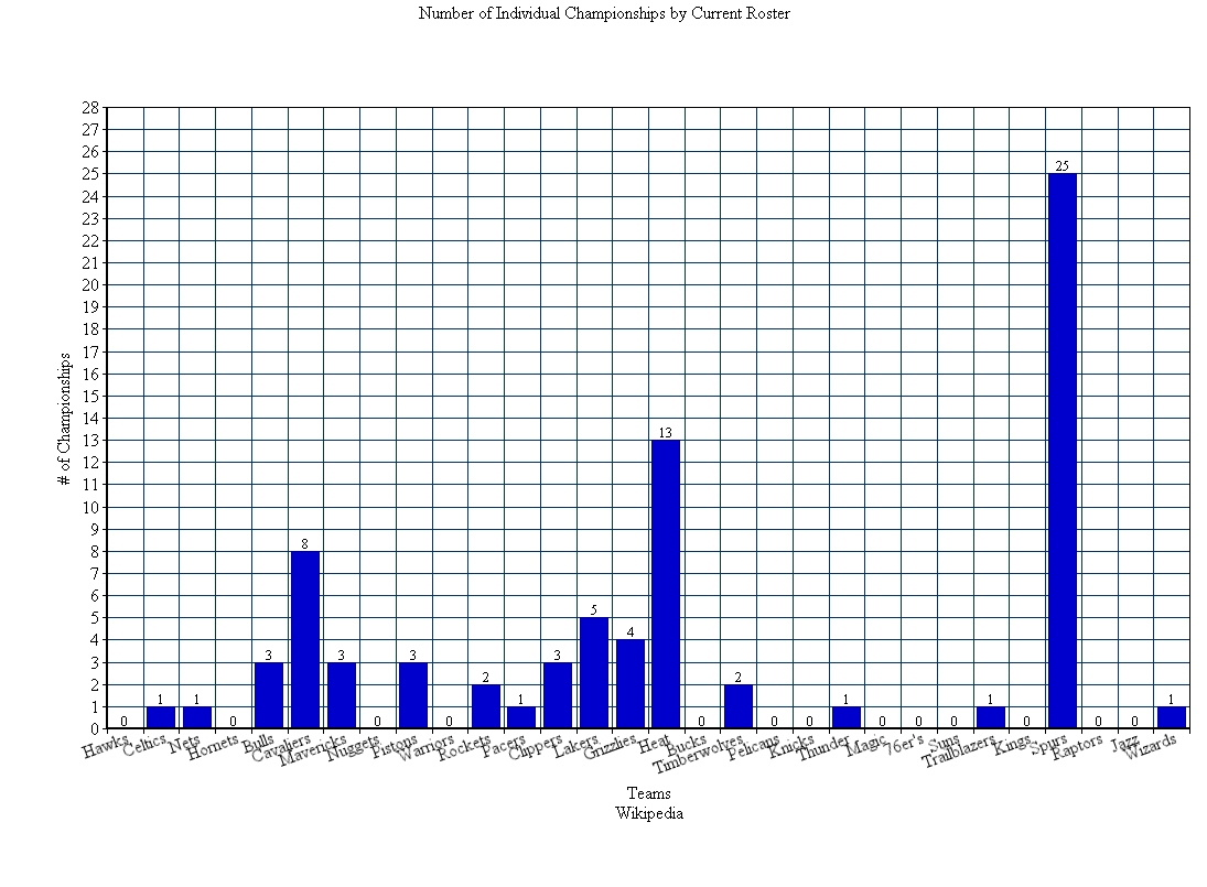 Graphique intéressant signé aypeef et qui nous montre quelles équipes possèdent le plus de titres individuels au sein de leur roster. Sans grande surprise, les Spurs arrivent en tête avec pas moins de 25 bagues ! Suivent les joueurs du Heat avec 13 titres, puis les Cavaliers, avec 8. Pour le reste, on oscille entre 5 (Lakers) et 0 (13 équipes).