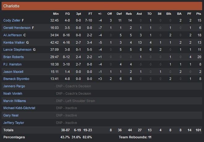 Klay Thompson ajoute 17 points pour les Warriors alors que Brian Roberts termine meilleur marqueur de Charlotte avec 20 points à 8/12 en sortie de banc. Al Jefferson signe 18 points et 5 petits rebonds, Kemba Walker shoote à 4/16 mais prend 13 rebonds et Lance Stephenson est toujours décevant (11 points à 3/8, 8 passes mais 6 balles perdues). Après 8 points inscrits rapidement, Curry perd le rythme et à 3″47 de la mi-temps, il est obligé de se diriger vers le banc avec 3 fautes au compteur. Le meneur réussira ensuite à éviter les coups de sifflet malgré les tentatives de ses adversaires pour le pousser à la faute.