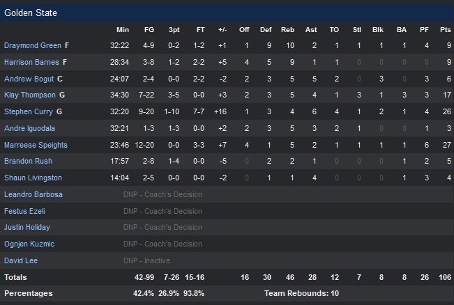 De retour à Charlotte où il a grandi, Stephen Curry a signé 26 points malgré une soirée difficile aux shoots (9/20, 1/10 à 3-points, 6 passes, 2 contres). Son coéquipier Marreese Speights s’est lui encore une fois révélé comme l’homme du match avec 16 de ses 27 points dans le quatrième quart-temps pour permettre à Golden State (13V-2D) de l’emporter 106-106. Une 8e victoire consécutive face à des Hornets (4V-13D) qui perdent, encore et toujours, sur une marge très réduite.