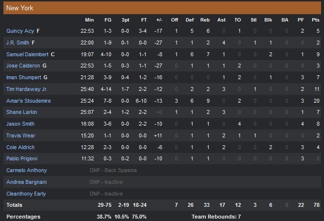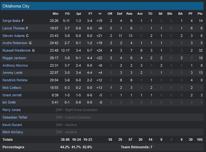 En l’absence de Carmelo Anthony (spasmes au dos), Amar’e Stoudemire a pris les rênes du match pour les Knicks (qui encaissent une troisième défaite de rang) avec 20 points à 7/8 et 9 rebonds. New York (4/22 dans le premier quart) shoote à un très faible 39% sur le match et aucun de ses titulaires n’atteint les 10 unités dans n’importe quel secteur statistique. De retour dans un rôle de lieutenant, Serge Ibaka signe 14 points à 5/11 et 6 rebonds, Jeremy Lamb inscrit lui 13 points dans la deuxième victoire consécutive de la saison pour OKC. Westbrook plante 10 points et 4 passes danas le premier quart et donne un avantage 21-5 au Thunder à 7″13 de la fin de la première période. Après deux 3-points consécutifs, le meneur souffle sur ses guns et compte 14 points (6/7) et 4 passes à 3″33 de la fin du premier quart.