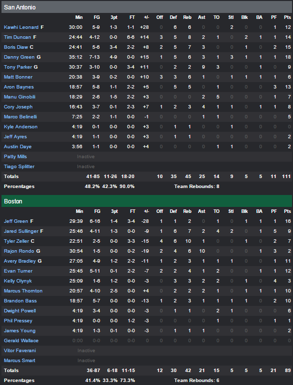 L’homme du match pour les Spurs c’est Danny Green avec 18 points à 7/13 alors que Boris Diaw signe 15 points à 5/6 et 7 rebonds, Kawhi Leonard 12 points et 6 rebonds alors que les trois stars Tony Parker (9 points à 3/10 et 9 passes), Tim Duncan (14 points à 4/12 et 8 rebonds) et Manu Ginobili (7 points à 2/7) n’étaient pas dans un grand jour. Les remplaçants Corey Joseph (8 points) et Aron Baynes (13 points) ont eux largement contribué à tuer le match en dernier quart. Du côté de Boston, la grosse baisse d’adresse entre la fin du troisième quart et le dernier a été fatale (41.4% sur le match). Jeff Green est le meilleur marqueur avec 16 unités mais à 6/16 tandis qu’Evan Turner marque 12 points. Rajon Rondo n’a pas pesé sur le match comme à son habitude avec 2 points à 1/5 mais 10 passes.
