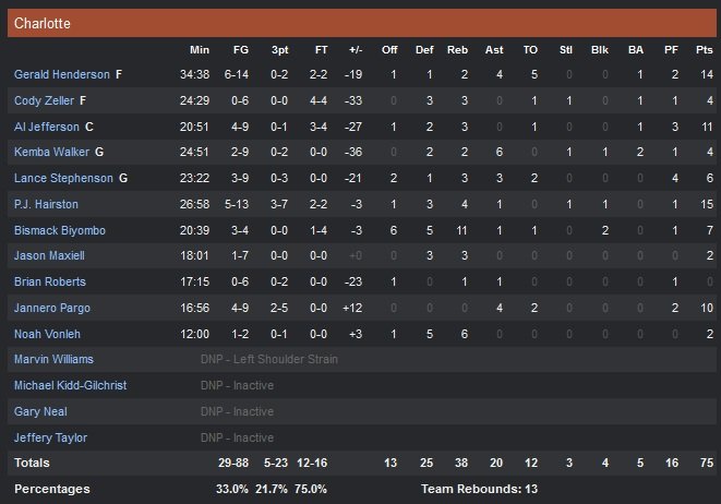 Loin d’être classés dans les meilleures défenses de la ligue (24e avant ce match), les Hawks avaient déjà prouvé qu’ils pouvaient faire l’effort contre Detroit la veille. Al Jefferson (11 points à 4/9 et 3 rebonds) était d’ailleurs le seul Hornet à atteindre les 10 points durant la rencontre avant que le rookie P.J. Hairston (15 points) ne marque son 10e point en début de quatrième quart. Kemba Walker et Lance Stephenson passent à côté de leurs matchs et combinent pour un magnifique 5/18. Depuis la blessure de Michael Kidd-Gilchrist (pied), les Hornets enregistrent un bilan catastrophique de 1 victoire pour 9 défaites.