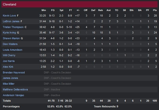 Bien servi dès le début du match, Kevin Love (22 points à la mi-temps) plante 16 points dans le premier quart-temps. Il rentre au passage ses 5 premiers shoots, dont deux 3-points. Cleveland prend jusqu’à 19 points d’avance dans les 12 premières minutes mais Indiana, qui a retrouvé David West (meilleur marqueur des Pacers avec 14 points), mais perdu Roy Hibbert (cheville, 4e match d’absence) et prouvé que l’équipe pouvait jouer sans ses stars, recolle à 52-49 à la mi-temps grâce à un 13-0 (6 points de Luis Scola durant le run) pour revenir dans le match. Cleveland reprend le contrôle dans le troisième quart avec 11 points de James (qui semblait s’être fait mal au poignet dans le troisième quart tout en restant sur le terrain). Les 20 points d’écart sont atteints avant le début du quatrième.