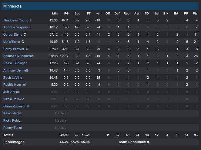 Surmotivé pour jouer son ancienne équipe, Mo Williams termine à 21 points et 11 passes. Malgré seulement 9 joueurs disponibles dans l’effectif, Minnesota est jeune et mène 30-22 dans le deuxième quart-temps suite à un jump shot d’Anthony Bennett. Portland comble son déficit en revenant à 36 partout sur un 3-points d’Allen Crabbe. Finalement, un buzzer d’Aldridge sur layup permet à Portland de mener de 8 points à la pause, 48-40.