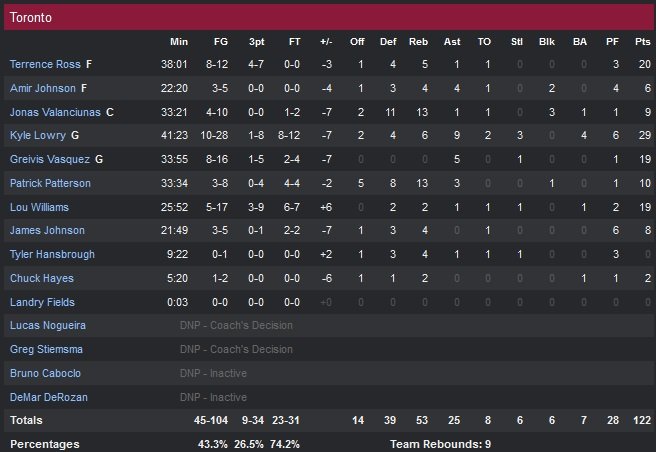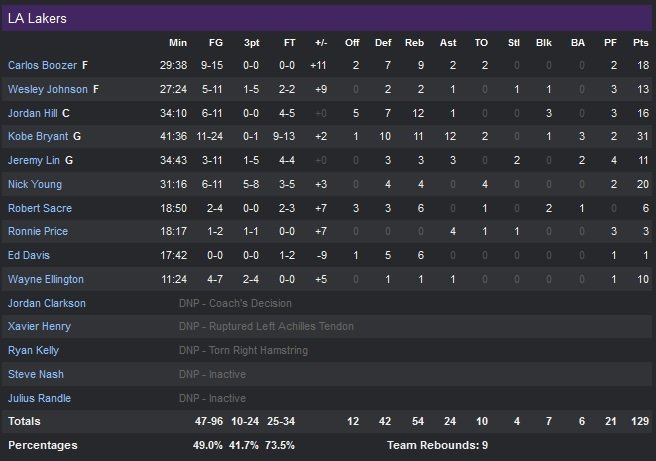 20 points à 5/8 de loin pour Nick Young, 18 points à 9/15 et 9 rebonds pour Carlos Boozer, 16 points et 12 rebonds de Jordan Hill, 13 points de Wesley Johnson et 11 de Jeremy Lin. Même Wayne Ellington a apporté sa contribution avec 10 unités. Côté Raptors (13V-4D) Kyle Lowry signe 29 points, 9 passes 6 rebonds avant de sortir pour 6 fautes alors que le match était déjà perdu à 2.8 secondes de la fin de la prolongation. Terrence Ross apporte 20 points, Lou Williams 19 tandis que Greivis Vasquez finit à 19 points pour sa première titularisation.