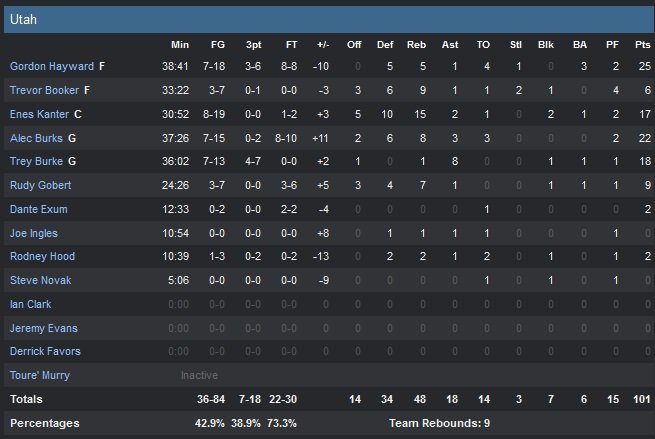 Gordon Hayward signe 25 points à 7/18 et 5 rebonds, Alec Burks 22 points à 7/15 et 8 rebonds et Trey Burke 17 points à 7/13 et 8 passes mais le Jazz, qui avait pourtant remonté un déficit de 22 points acquis en première mi-temps, perd pour la 6e fois consécutive, leur plus longue série de défaites depuis mars dernier. Denver est devant 24-23 dans le premier quart-temps avant de passer un 22-4 à ses adversaires. Bien pressants en défense, les Nuggets forcent 11 balles perdues d’Utah en première mi-temps. Le banc de Brian Shaw se révèle également bien plus efficace avec un avantage de points de 29-4 en première mi-temps et 38-13 sur le match. Sans Derrick Favors (grippe) le Jazz souffre à l’intérieur malgré un bon match de Rudy Gobert (9 points 7 rebonds et 1 contre). C’est d’ailleurs le Français qui va marquer le comeback de son équipe en égalisant à 83 partout sur alley oop après avoir été mené 80-67 en fin de troisième quart-temps.