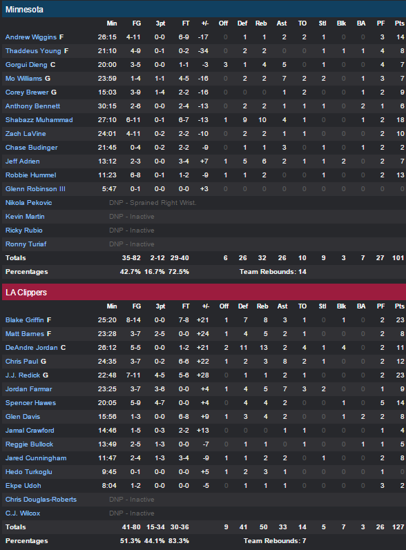 Blake Griffin et JJ Redick ont inscrit 23 points chacun (Reddick a signé deux actions à 4 points dans le match) avant de rester tranquillement assis sur le banc pour le dernier quart temps alors que le match était déjà plié avec un score de 101 à 68. DeAndre Jordan a ajouté 13 points et 11 rebonds alors que Chris Paul compile lui 12 points et 8 passes.