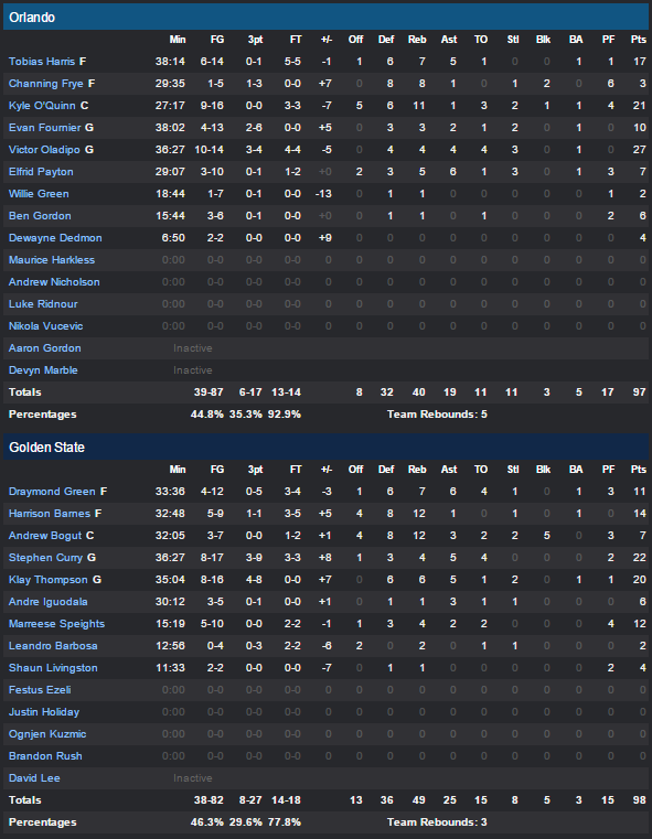 Orlando a résisté grâce à Kyle O’Quinn et Tobias Harris mais l’échéance n’a pas pu être repoussée jusqu’au buzzer. Après une possession où les Warriors ont tenté de faire le break avec trois trois points tentés et des rebonds offensifs récupérés, Harris a donné l’avantage au Magic avec 38 secondes à jouer. Derrière Andrew Bogut a raté un alley-oop et derrière sur le layup manqué d’Elfrid Payton, Stephen Curry a remonté le terrain pour se stopper sur la ligne à trois points et balancer le shoot de la gagne.