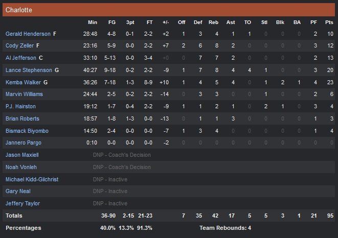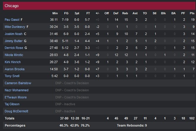 Pour leur 12e défaite en 13 matchs, les Hornet, qui sortaient de trois jours de repos, ont pourtant eu le droit à un bon Lance Stephenson qui enregistre son meilleur match offensif de la saison avec 20 points (9/18, 8 rebonds et 4 passes). Kemba Walker répond aussi présent avec 23 points (7/18) mais l’exécution des Bulls (qui font 10 passes de plus, 27 assists à 17 dans le match) fait beaucoup souffrir l’équipe de Steve Clifford. Dans cette attaque bien équilibrée, Jimmy Butler et Derrick Rose se contentent chacun de 15 points. Gasol tourne à 20 points et 11.2 rebonds cette saison et signe ici son 10e double-double de la saison (acquis dès le milieu du troisième quart-temps). Chicago domine le rebond (49-42), l’adresse (46.3% à 40%) et malgré le score serré, a toujours gardé la main sur le match.