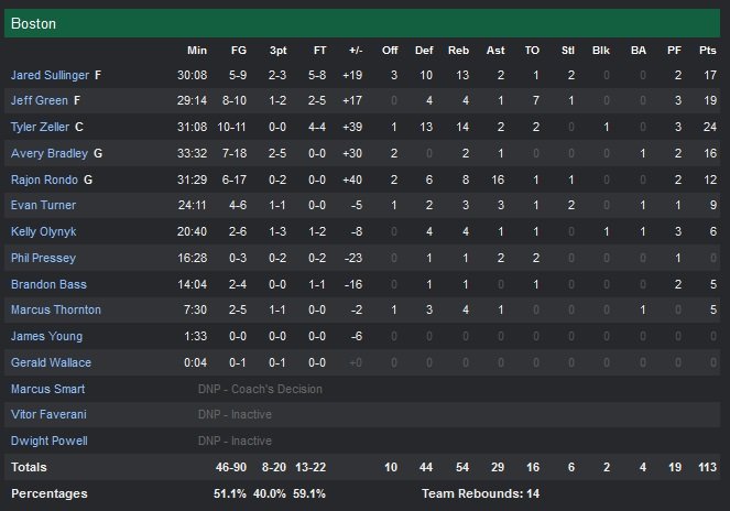 Les confrontations entre Celtics et Lakers n’ont plus grand chose à voir avec celles de 2008 ou 2010 mais cela reste toujours un événement. Cette nuit les Celtics ont impressionné devant leur public avec une victoire 113-96 obtenue grâce à un travail de longue haleine maintenu tout au long de la rencontre. Tyler Zeller signe sa meilleure performance de la saison avec 24 points et 14 rebonds, bien servi par Rajon Rondo et ses 16 passes, auxquelles il faut ajouter 12 points et 8 rebonds.