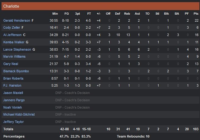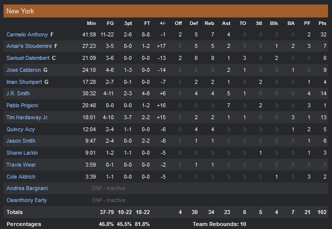 Gerald Henderson est ainsi le meilleur scoreur des Hornets avec 22 points (8/10) alors qu’Al Jefferson (qui a bien fait souffrir Amar’e Stoudemire) signe un nouveau double-double avec 16 points à 8/21 et 13 rebonds. Lance Stephenson avait lui retrouvé confiance avec 16 points à 7/15, 6 rebonds et 6 passes. En face le cinq majeur des Knicks est trop discret et seuls J.R. Smith et Tim Hardaway Jr se rendent utiles en sortie de banc malgré un pourcentage moyen. Les Knicks vont pourtant remonter un déficit de 20 points en fin de troisième quart-temps pour finalement prendre la tête du match à moins d’une minute. Charlotte mène ainsi 80-60 avant que le Melo Show ne démarre.