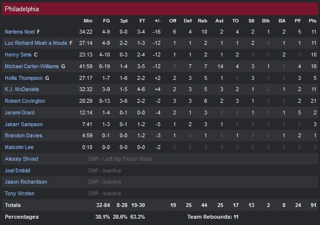 Pour la première victoire du Thunder en présence de son duo de stars cette nuit. Russell Westbrook a pris ses responsabilités avec 27 points à 8/14, 7 passes et 5 rebonds et Oklahoma City (6V-13D) s’impose 103-91 chez les 76ers (1V-18D), que Kevin Durant ne voulait pas sous-estimer. Le MVP en titre est en difficulté dans la rencontre avec seulement 10 points à 3/11 et 6 rebonds. Serge Ibaka ajoute lui 19 points et 3 contres, Jeremy Lamb suit avec 15 unités.