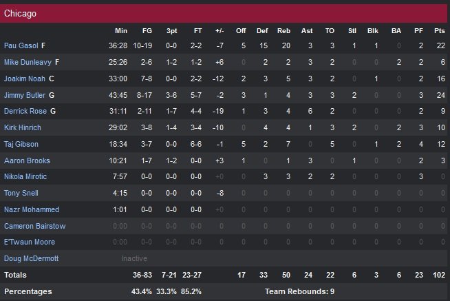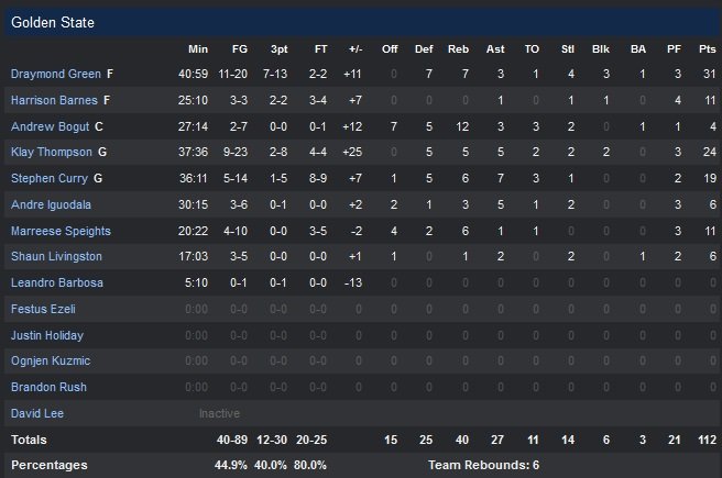 Klay Thompson ajoute 24 points 5 rebonds 5 passes 2 interceptions et 2 contres et les Warriors (10V-1D à l’extérieur) comptent désormais 17 victoires pour 2 défaites. Jimmy Butler mène les Bulls au scoring avec 24 points mais Pau Gasol réalise la performance du soir avec un énorme 22 points et 20 rebonds. Joakim Noah est lui finisseur avec 16 points à 7/8, 5 rebonds et 3 passes mais Chicago a toujours du mal à gagner à la maison (2V-5D). Le rythme effréné imposé par les Warriors blesse rapidement Chicago, qui encaisse 27 points sur contre-attaque en première mi-temps (pour 7 inscrits). Chicago (23 pertes de balles) ouvre le deuxième quart sur un 11-0 pour repasser devant 33-28 mais après un temps-mort de Steve Kerr, Golden State se reprend et passe un 33-16 à ses adversaires pour mener 61-49 à la mi-temps.