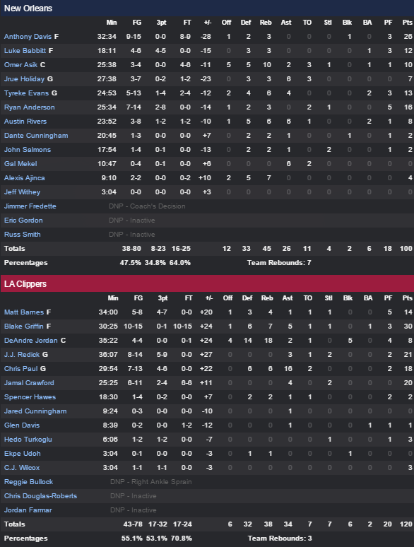 Anthony Davis n’a pas pu peser sur la rencontre comme à son habitude malgré 26 points à 9/15 et seulement 3 rebonds (il faut dire que DeAndre Jordan en a capté 18) et 1 contre, très bien contenu par Blake Griffin. Tyreke Evans (13 points à 5/13) et Jrue Holiday (7 points à 3/7) n’étaient pas non plus dans un grand soir limitant ainsi les chances des Pelicans malgré la bonne prestation des remplaçants Anderson et Babbitt (12 points)