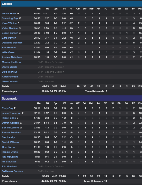 Tobias Harris bat son record de saison avec 27 points alors que Victor Oladipo en ajoute 16 (en plus de 7 passes), Evan Fournier 15 et Kyle O’Quinn 13. Dans le sillage de ce quatuor le Magic a fait la course en tête quasiment tout le match mais les Kings ont fait l’accordéon. 27-27 après le premier quart grâce à Darren Collison (8 de ses 22 points dans les 12 premières minutes) puis en début de second Orlando a fait le break pour prendre une dizaine de points d’avance grâce à un bon banc mené par Ben Gordon (11 points). Rudy Gay (16 points) et Jason Thompson (18 points à 9/12) ont ramené les leurs à seulement 3 points à la pause mais ils ont continué de faire l’accordéon en troisième, incapables de limiter l’attaque adverse (50.6% aux tirs pour le Magic et seulement 10 ballons perdus). D’entrée Harris a fait le break en troisième et le duo Gay – Thompson a permis à Sacramento de s’accrocher malgré une grosse maladresse dans ce quart où ils n’ont inscrit que 17 points. Orlando a entamé le dernier acte avec 11 points d’avance avant que Ben Gordon le porte à 16, moment choisi pour Collison et Williams pour ramener les leurs dans le sillage à 90-90, mais le money time a été largement en faveur des visiteurs, bien plus adroits (44.3% pour Sacramento et 4/15 à trois points)