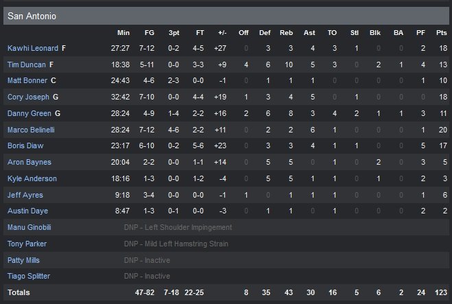 L’épaule pour Manu Ginobili et les ischio-jambiers pour Tony Parker, les deux joueurs ont été forcés de se reposer cette nuit. Ce qui n’a pas franchement posé problème aux Spurs pour aller chercher une 15e victoire en 20 rencontres cette saison. Marco Belinelli termine meilleur marqueur des Spurs (dont l’intégralité des joueurs de la feuille de stats ont inscrit au moins 2 points, soit 11 joueurs !) avec 20 points (7/12, 4/6 à 3-points) alors que Tim Duncan signe un petit double-double classique de 13 points et 10 rebonds en seulement 18 minutes passées sur le parquet de l’AT&T Center dans la victoire facile des Spurs 123-101.