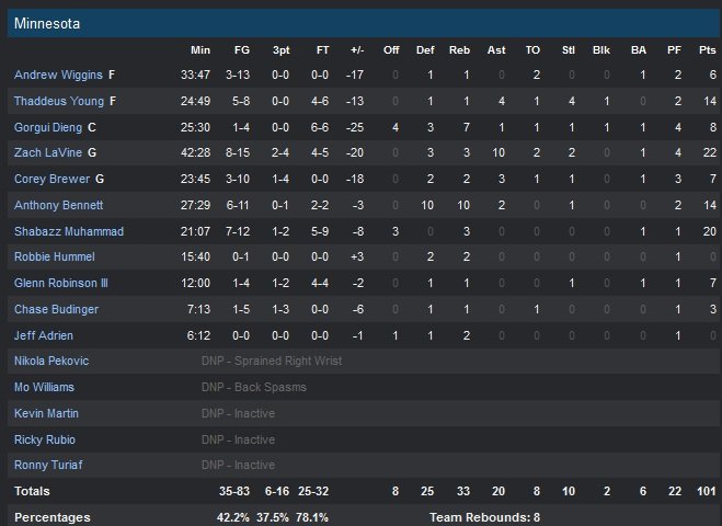 Le collectif des Texans a encore parlé avec 7 joueurs à au moins 10 points (Kawhi Leonard 18, Cory Joseph 18, Boris Diaw 17) mais surtout 30 passes décisives délivrées par les Spurs sur ce match, leur record de la saison pour le moment. Ce succès est également la 10e victoire en 11 matchs des hommes de Gregg Popovich. En face la jeunesse des Wolves marquent des points (Zach LaVine 22 points et 10 passes, premier double-double en carrière, Shabazz Muhammad 20 points) mais perd son 5e match consécutif. Thaddeus Young aura offert, sur le premier panier du match, la seule petite avance du match à Minnesota, sur un shoot loin du panier.