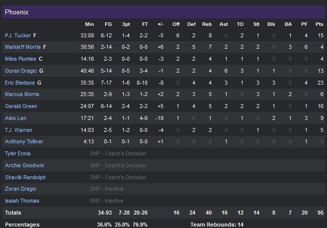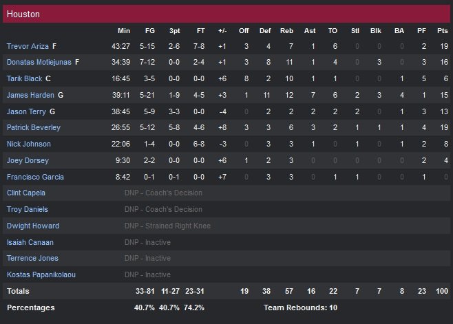 Les joueurs de Kevin McHale sont devant de 17 points (63.6% de réussite contre 29% pour Phoenix sur les 12 premières minutes) après un quart-temps et pousse le score à 41-20 après un 6-2 en début de deuxième. Gerald Green (16 points) réveille les siens (Markieff Morris set à 0/7 en début de match) avec 4 points rapides pour débuter un 11-2 en faveur de Phoenix qui rapproche les visiteurs à 43-31 en milieu de quart-temps. Houston inscrit les 7 points suivants et à la pause, compte 19 points d’avance, 60-41. Sans Howard Donatas Motiejunas profite à fond de son temps de jeu avec encore un bon match (16 points 11 rebonds) alors que James Harden signe 15 points, 12 rebonds et 7 passes. Jason Terry rentre un 3-points pour débuter le troisième quart-temps mais Phoenix profite de 4 ballons perdus des Rockets pour marquer les 8 point suivants et recoller à 63-49. Eric Bledsoe (22 points) inscrit les 5 derniers points de cette série. Après ce trou noir, c’est encore Terry qui met dedans en milieu de quart-temps puis Beverley l’imite après une claquette de P.J. Tucker (15 points), 68-51. Un 3-points d’Alex Len (!) fixe finalement le score à 80-67 avant de jouer le quatrième quart-temps.