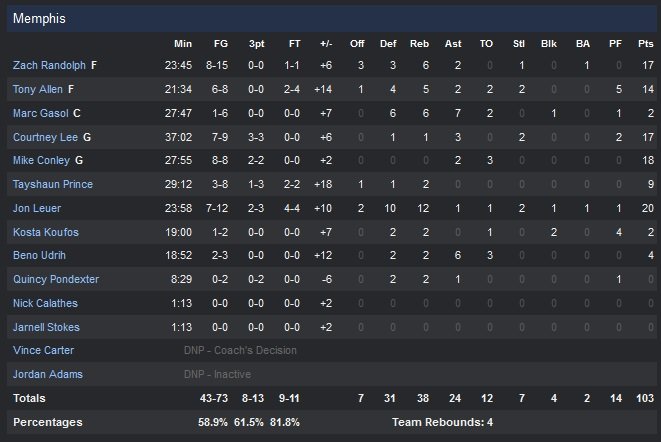 Les joueurs de Dave Joerger shootent à 59% (8/13 à 3-points) face au 49% de Miami (5/16 derrière l’arc. Dwyane Wade inscrit 25 points dans la 4e défaite consécutive de son équipe et est suivi par Josh McRoberts (14 points), Luol Deng (13 points) Chris Bosh et Mario Chalmers (12 points). Les deux équipes sont très adroites en première mi-temps et tournent autour des 50% de réussite. Memphis se construit une avance de 10 points mais est vite retrouvé par Miami qui passe un 12-4. Les Grizzlies bouclent leur mi-temps par un 9-2 et sont devant 55-48 à la pause grâce à 11 points d’Allen, Randolph et Leuer. Dwyane Wade est à ce moment du match déjà le meilleur marqueur du Heat avec 15 points et les deux équipes prennent bien soin du ballon avec seulement 4 turnovers pour Miami et 5 pour Memphis.