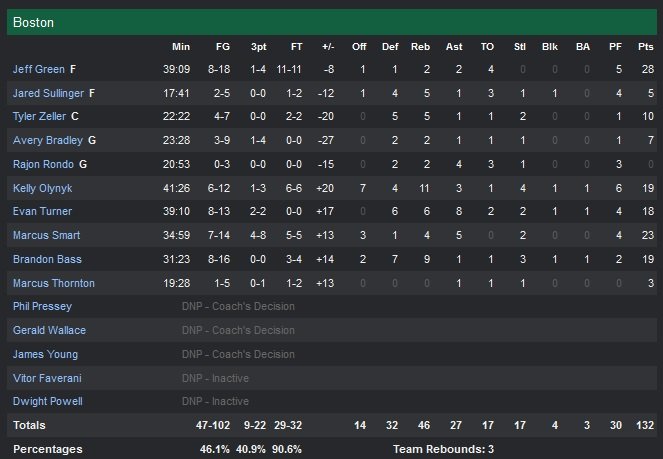 Résultat les Celtics recollent à 110-107 à 16 secondes du premier buzzer de la partie. Olynyk rate un 3-points après un lancer de Kris Humphries mais Green prend le rebond et Evan Turner (18 points) plante un 3-points dans le corner à 0.9 secondes pour forcer une première prolongation. C’est cette fois à Boston de lâcher du lest après avoir mené de 7 points en extra-période. Paul Pierce (qui a dépassé Reggie Miller à la 16e place des meilleurs scoreurs avec 25 282 points) égalise à 121 partout sur un 3-points clutch à 39 secondes et les deux équipes ratent toutes leurs tentatives dans les 10 secondes finales. Wall replace les Wizards à 132-130 avec 53 secondes à jouer en deuxième prolongation. Après un raté de Smart de loin, Bradley Beal (14 points 5 passes) prend le rebond et sert Wall, qui trouve un 2+1 qui permet à Washington de mener 133-132 à 44 secondes. Vainqueurs de leurs trois dernières rencontres, les Celtics s’inclinent finalement sur un ultime shoot raté de Turner à 0.9 seconde