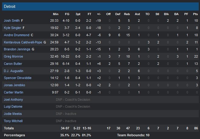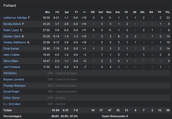 Greg Monroe, sorti du banc, est le seul Piston en réussite avec 22 points et 10 rebonds (40 points du cinq majeur pour l’équipe de Stan Van Gundy) et un formidable 35.1% de réussite (48.8% chez les Blazers). L’une des pires équipes au scoring dans la peinture (44% de réussite à l’intérieur en première mi-temps), Detroit subit dès le début du match et regarde Portland développer son jeu. Les Trail Blazers prennent le contrôle grâce à leur défense dans le troisième quart-temps, tenant les Pistons à un triste 22% (4/18) tout en prenant le soin d’étendre leur avance à 17 points. Le score est de 76-62 avant de débuter le quatrième quart-temps. Detroit se réveille enfin mais il est un peu trop tard. Sur un layup de Monroe, les Pistons recollent à 81-77 avec 7″12 à jouer mais les deux paniers d’Aldridge et un 3-points de Damian Lillard (14 points ) 6/14, 6 passes et 5 rebonds) stoppe vite la tentative de comeback. Natif du Michigan, Chris Kaman s’est fait plaisir avec un 6/8 et 12 points en première mi-temps.