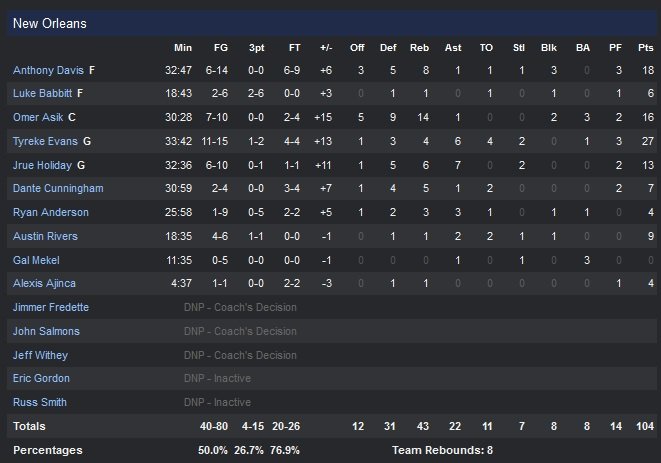 Omer Asik a lui aussi répondu présent avec 16 points et 14 rebonds alors que Jrue Holiday est complet avec 13 points, 6 passes 6 rebonds. Comme d’habitude, les Knicks n’étaient pas loin au score en fin de match mais se sont encore inclinés, alors que Carmelo Anthony est limité à 17 points (6/11, 8 rebonds), soit le même total que Pablo Prigioni. Les deux équipes dépassent les 47% de réussite en première mi-temps ce qui empêche toute avance de plus de 5 points pour quiconque. Evans signe 15 points en deux quarts-temps (16 pour Stoudemire) dont un layup qui égalise à 50-50 à 2″34 de la mi-temps. À la pause, New Orleans est devant 54-52.