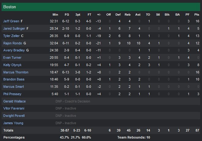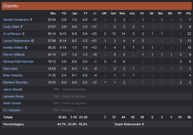 Pour une fois, les Hornets n’ont pas eu à batailler dans les dernières secondes pour obtenir une deuxième victoire consécutive cette nuit. Al Jefferson signe 23 points à 9/15 et 14 rebonds à la Time Warner Cable Arena et Charlotte s’impose 96-87 malgré le triple-double de Rajon Rondo (12 points, 10 rebonds et 10 passes). Kemba Walker ajoute 18 points à 5/14, 7 passes, 5 rebonds et 2 interceptions et Lance Stephenson 13 points à 6/14, 4 rebonds et 4 passes.