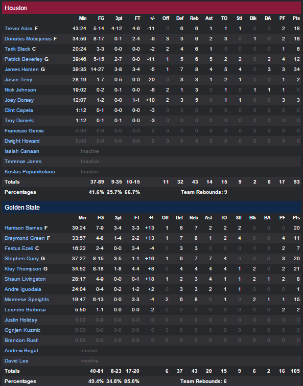Menés par un quatuor Stephen Curry (20 points à 8/15, 7 rebonds et 7 passes, Klay Thompson (21 points à 8/18), Harrison Barnes (20 points à 7/9 dont 3/4 à 3 points) et Marresse Speights (15 points et 8 rebonds) les Warriors ont fait basculer le match en leur faveur en dernier quart. Dans le sillage de James Harden (34 points à 14/27) et du duo Donatas Motiejunas (18 points et 6 rebonds) et Trevor Ariza (18 points) les Rockets ont fait la course en tête une très grande partie de la première mi-temps à la faveur d’un premier quart remporté 30-23. Mais l’adresse à trois points des Warriors, dont celle de Stephen Curry leur a permis de revenir en toute fin de mi-temps avec 9 points de Curry en 1’30 pour un score de 46-46 après 24 minutes. Les Warriors ont pourtant connu une disette de près de 5 minutes dans ce quart mais sans trop de conséquences.