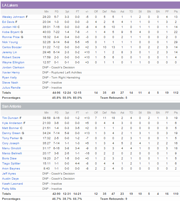 Young a signé 29 points à 9/14 dont 6/9 à trois points et Kobe Bryant 22 points mais à 7/22 et 9 passes. Carlos Boozer et Jeremy Lin ont été précieux en sortie de banc avec 14 points chacun, le même total que Jordan Hill. Sans Kawhi Leonard et avec un Tony Parker apparemment pas à 100% et qui n’a joué que 18 minutes les Spurs s’en sont remis à Tim Duncan (19 points et 18 rebonds). Ce dernier a dépassé Jerry West au classement des meilleurs marqueurs. Danny Green a ajouté 19 poins, Manu Ginobili 18 et Cory Joseph 16.