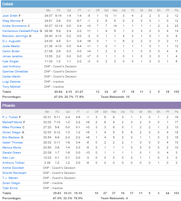 Andre Drummond a mené les Pistons avec 23 points et 14 rebonds tandis que Josh Smith ajoute 12 points tout comme Jodie Meeks, de retour, et Greg Monroe, titulaire. 7 Suns terminent à au moins 10 points dont 18 pour Goran Dragic, 17 pour Markieff Morris et 16 pour Eric Bledsoe mais ils ont mal géré leur fin de rencontre avec notamment des ballons perdus qui ont coûté cher. 17 ballons perdus sur le match qui ont conduit à 27 points de Detroit.