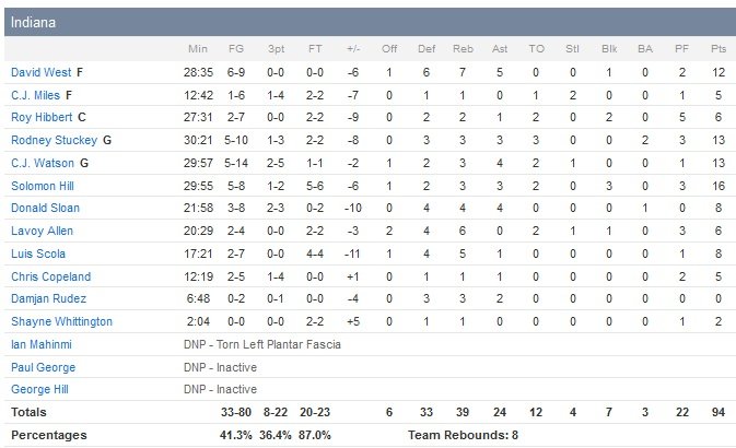 West et Watson inscrivent chacun 6 points dans le troisième et réduisent par deux fois le déficit à 4 points sans pour autant réussir à passer devant ou égaliser. Toronto est donc encore devant 80-72 avant d’entamer le dernier quart. Luis Scola démarre le quatrième quart par deux lancers francs, 80-74. Toronto répond par un 9-0 incluant 7 points consécutifs de Vasquez et prend le large 89-74 à 9″52, mettant fin aux espoirs d’Indiana qui espérait une première victoire depuis le 28 novembre.