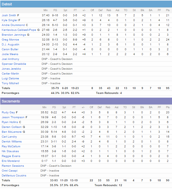 Malgré un 6/20 à trois points, 15 ballons perdus qui ont mené à 20 points adverses et 12 rebonds de moins, les Pistons s’imposent, notamment grâce à leur bonne présence intérieure et leur bonne défense qui a limité Sacramento à 35.5% à l’image du 8/22 de Gay (20 points), du 1/10 de Darren Collison (3 points et 7 passes). Seul Carl Landry (15 points à 5/8 et 11 rebonds) sort un peu la tête de l’eau.