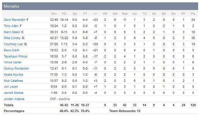 Michael Carter-Williams signe un triple-double sous les yeux de Will Smith assis au premier rang avec 16 points, 11 passes et 11 rebonds et les 76ers prendront jusqu’à 18 points d’avance. Déficit que les Grizzlies rattraperont durant les 7 dernières minutes (merci aux ballons perdus et à la sélection de shoots douteuse de Philadelphie, seule équipe à n’avoir pas encore gagné à domicile cette saison) du quatrième quart-temps avant d’exulter sur le shoot de Conley (14 points dans le quatrième). Zach Randolph était en mode «beast» avec 24 points à 10/14 et 11 rebonds alors que Marc Gasol signe 18 points à 6/11 et 9 rebonds.